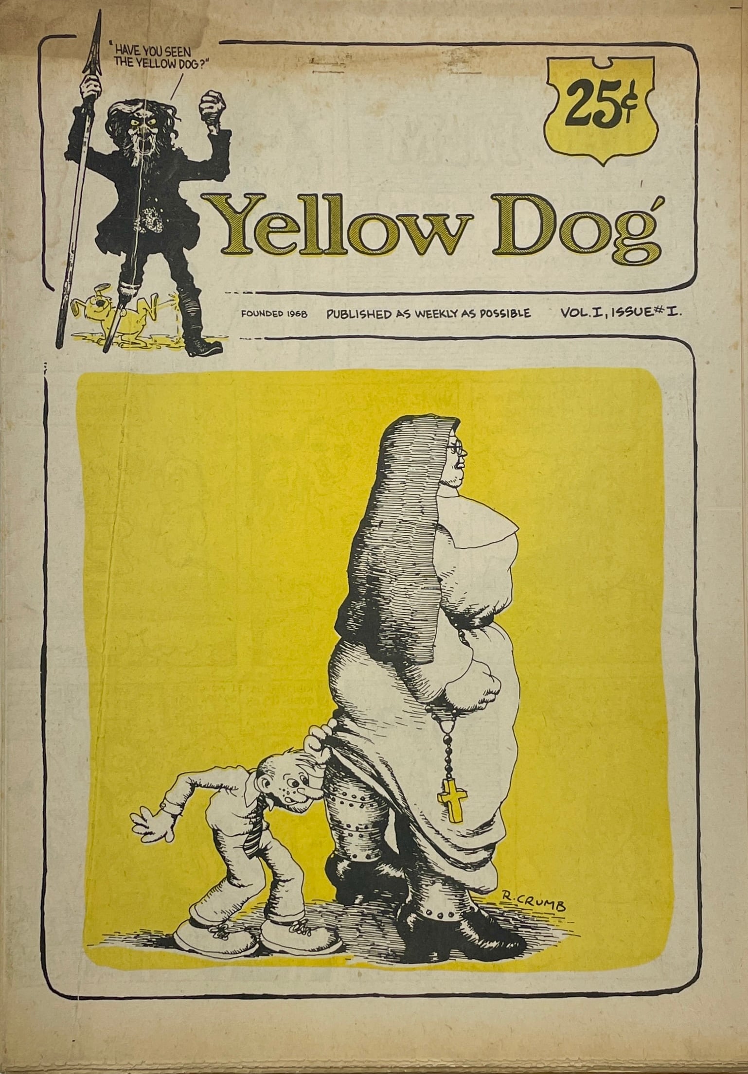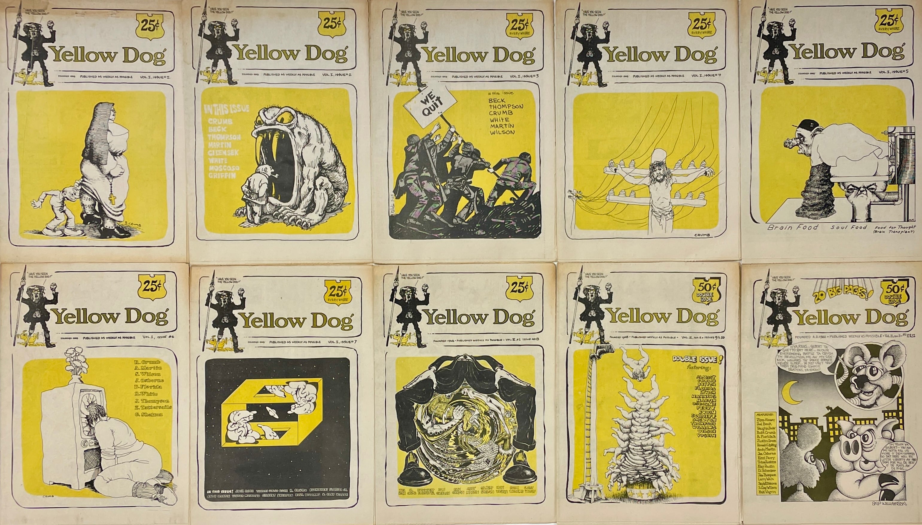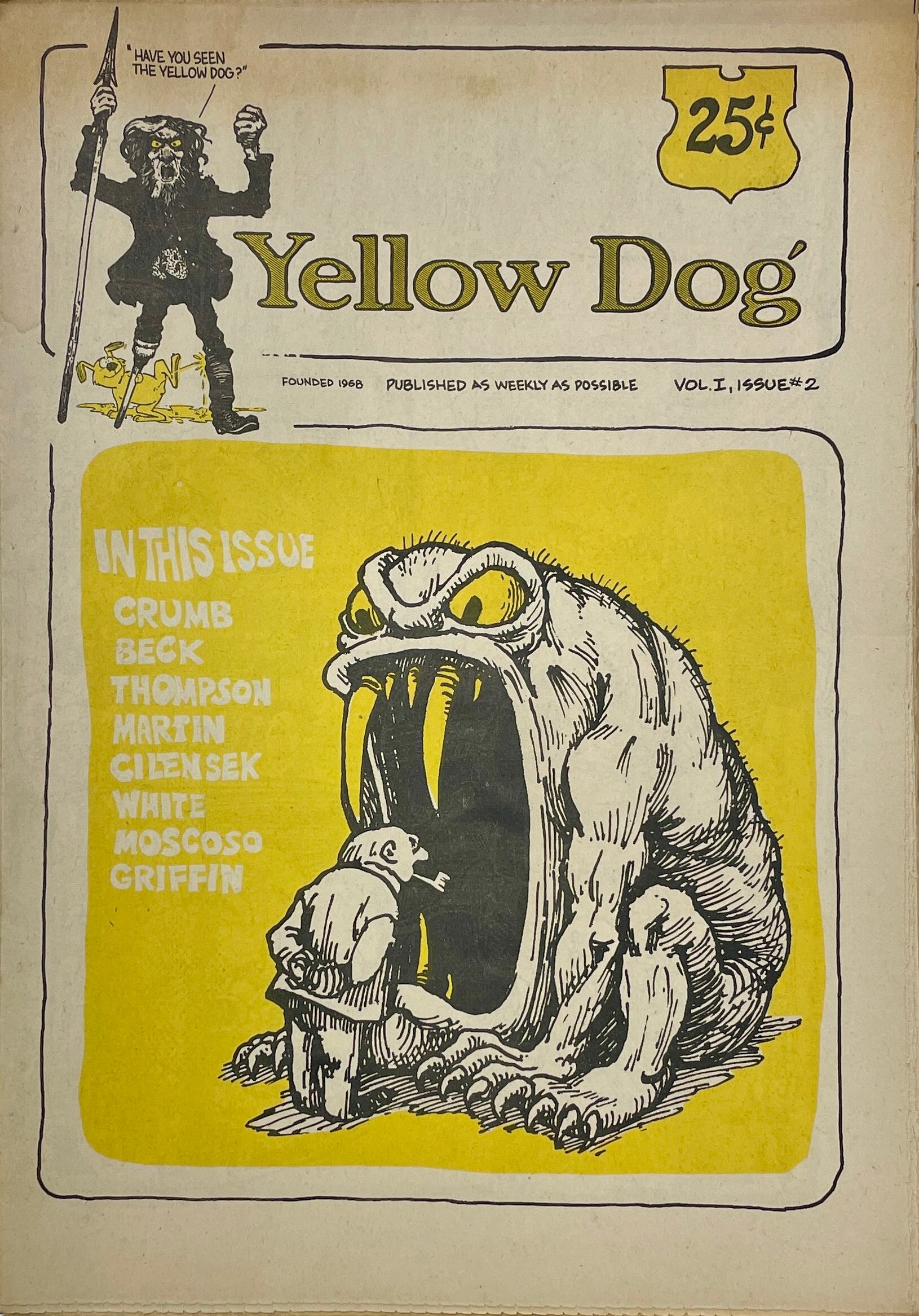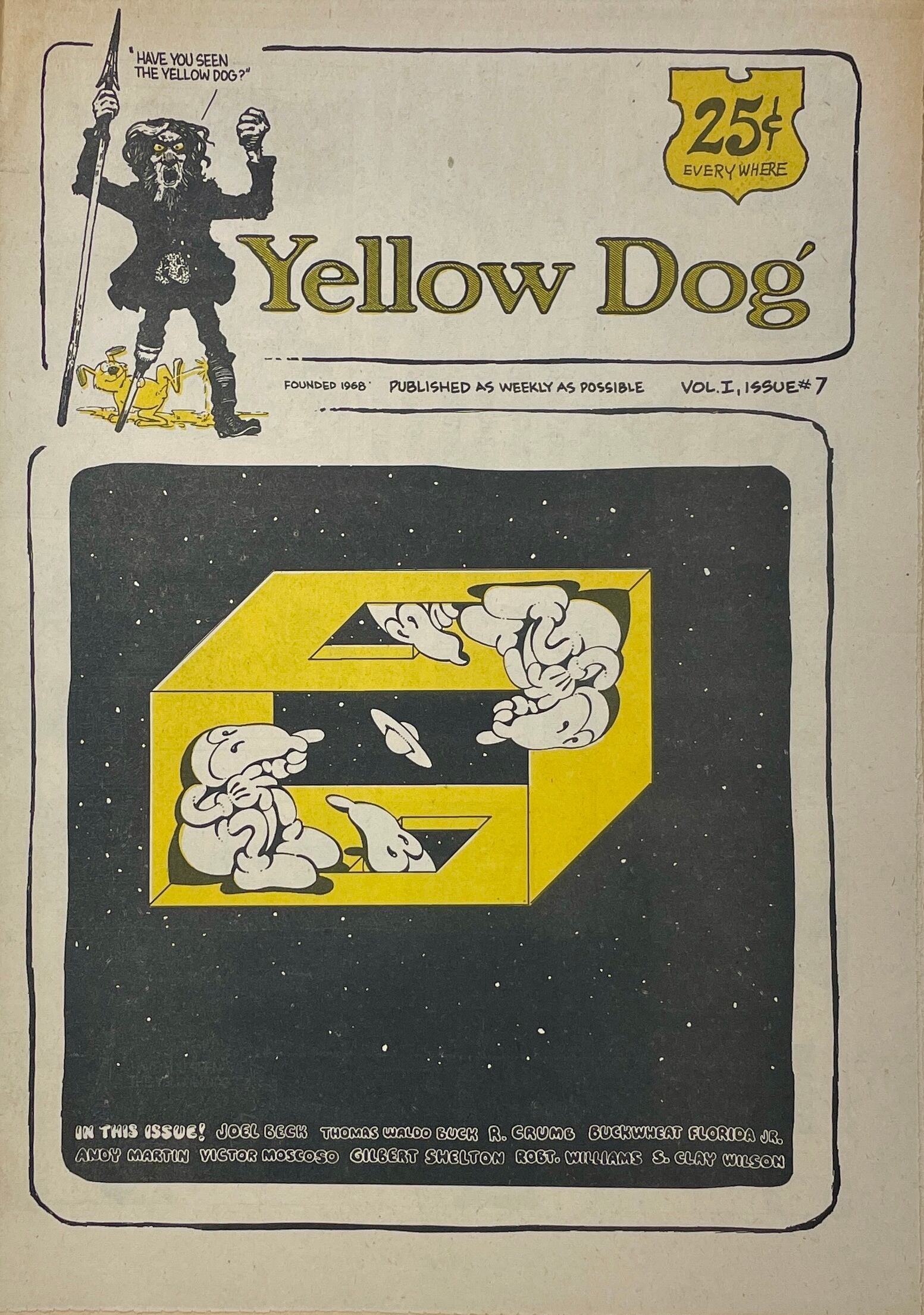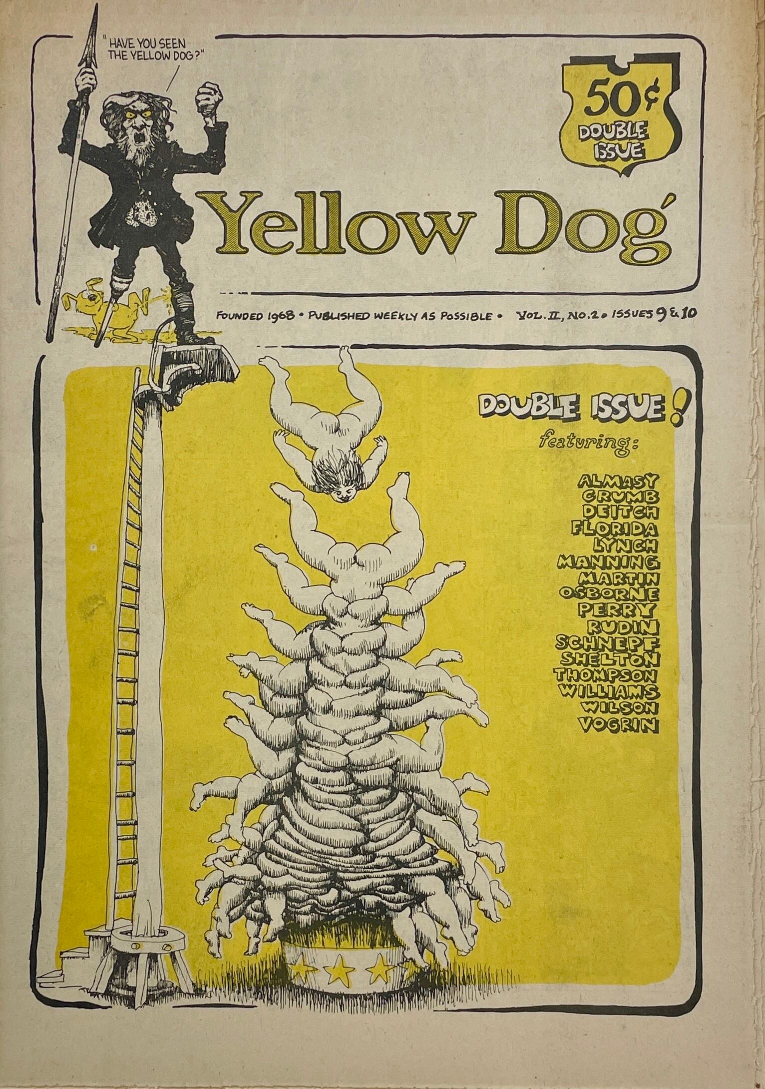 Peter Almasy, Robert Crumb, Kim Deitch, Buckwheat Florida Jr., Don Grant, Jay Lynch, Dave Manning, Andy Martin, Jim Osborne, Kent Perry, Kay Rudin, Bob Schnepf, Gilbert Shelton, John Thompson, Hak Vogrin, Robert Williams, S. Clay Wilson Double-issue; Kay Rudin becomes Yellow Dog's first female contributor.