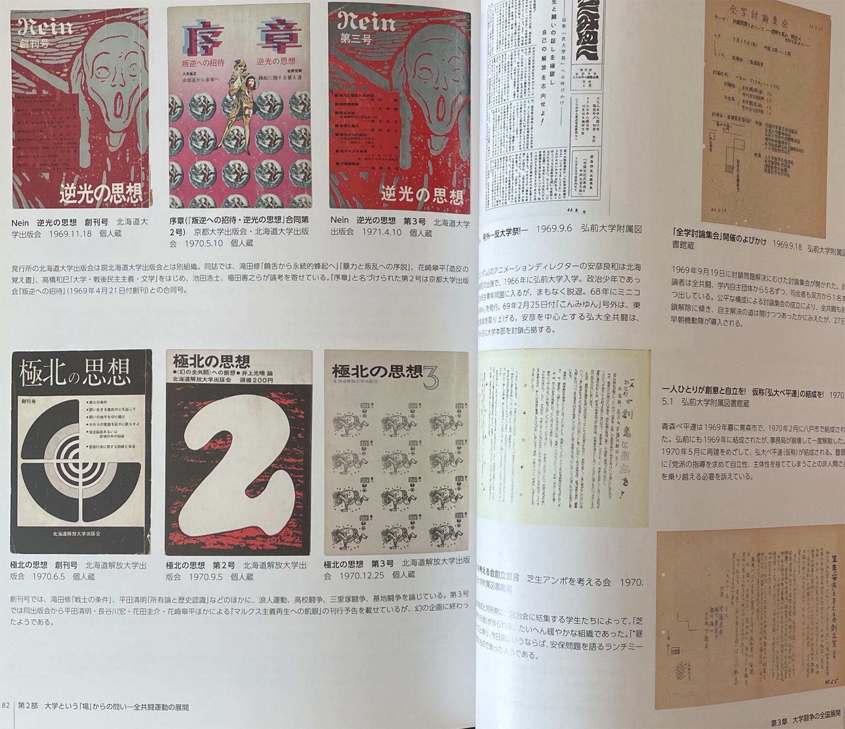 ガリ版、スクスクリーン、ビラ、パンフレット、ポスター、チケット、雑誌、旗、ヘルメットなど68年資料が多数掲載。見応え大いにあり。