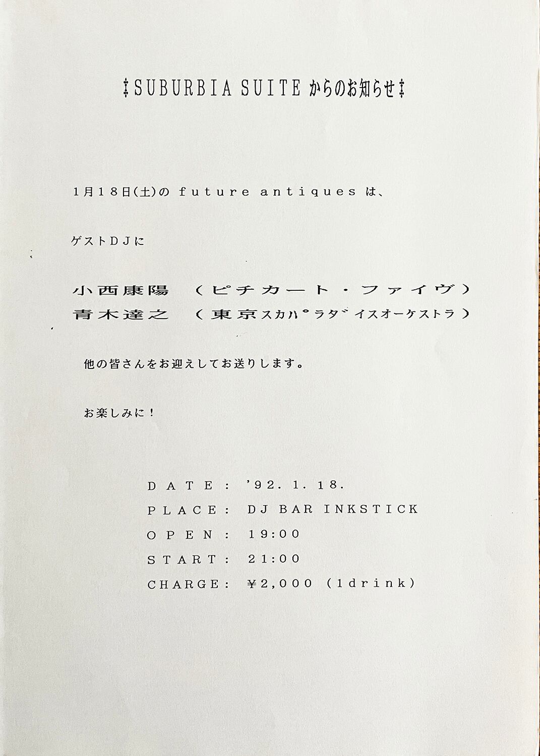 SUBURBIA SUITEのイベント「future antiques」( at DJ BAR INKSTICK インクスティック)のポスター(51.5×36.5)チラシ付き
